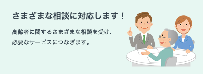 地域で暮らす高齢者の皆様やそのご家族の総合相談窓口として、介護保険サービスから認知症・権利擁護についてなど幅広く相談を承っております。